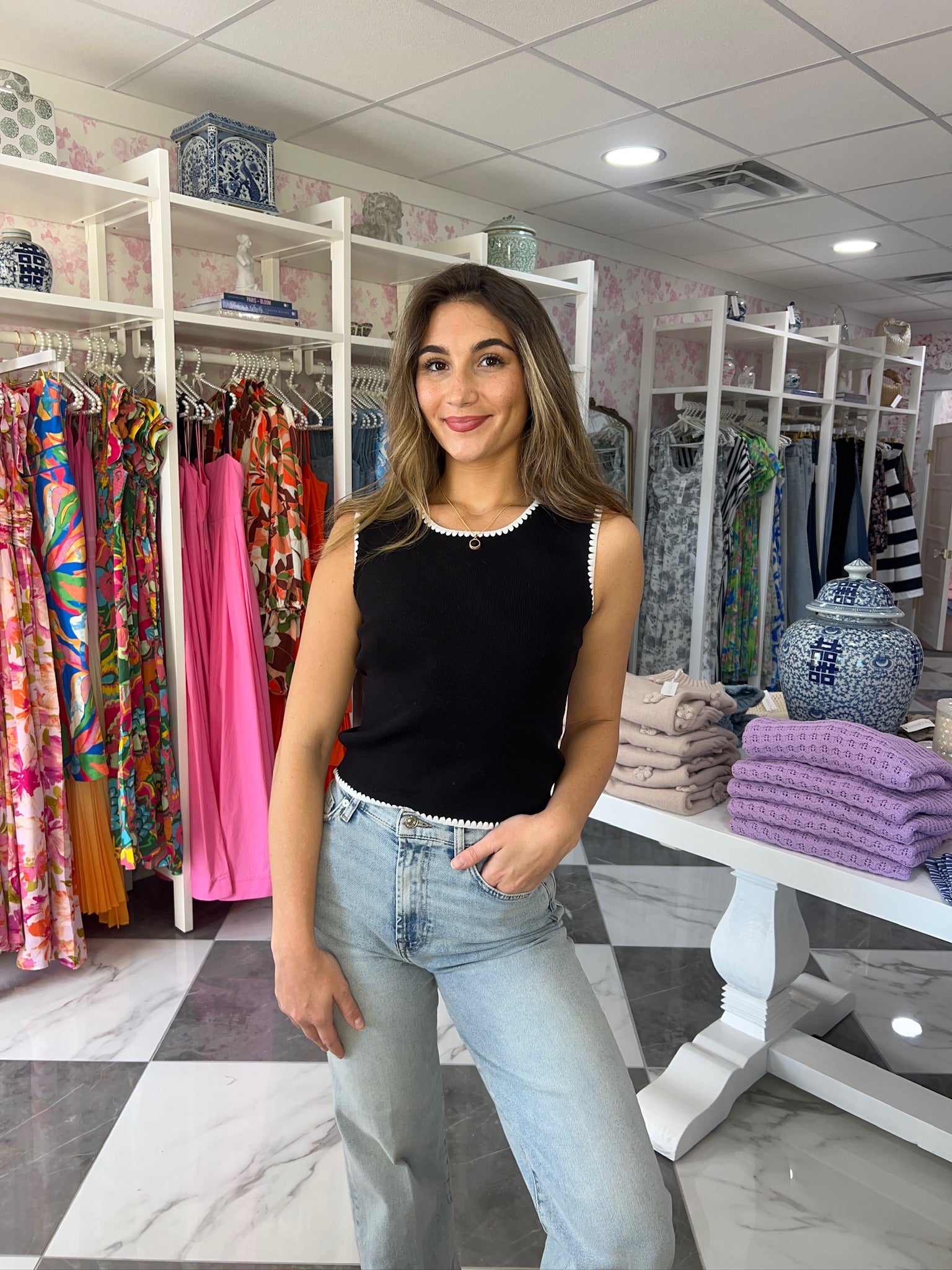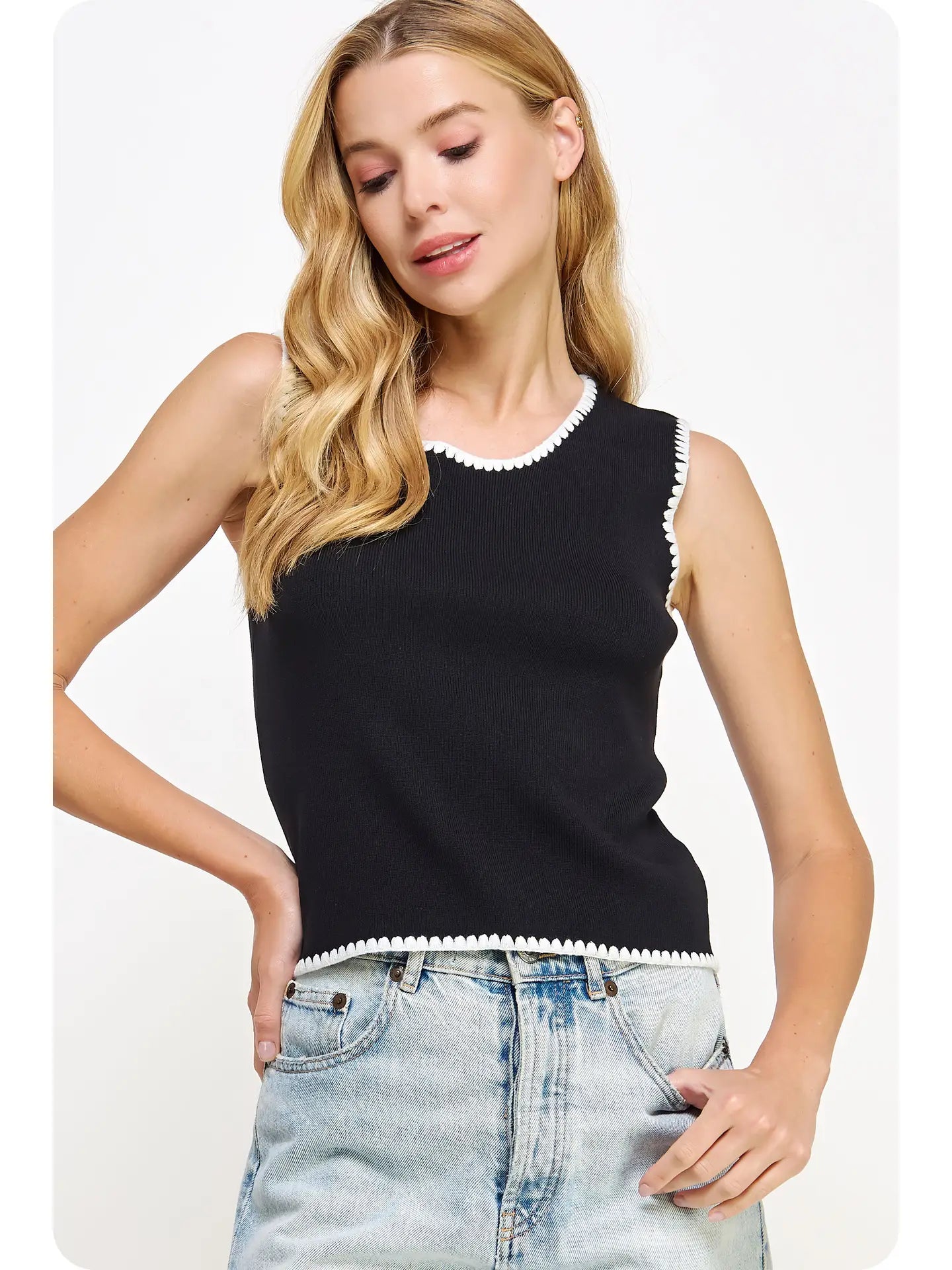 Embroidered tank top in stretch knitted fabrication. This versatile sleeveless top features embroidery detail at neckline/armhole/hem and a round neckline. Comes in Black or Beige.