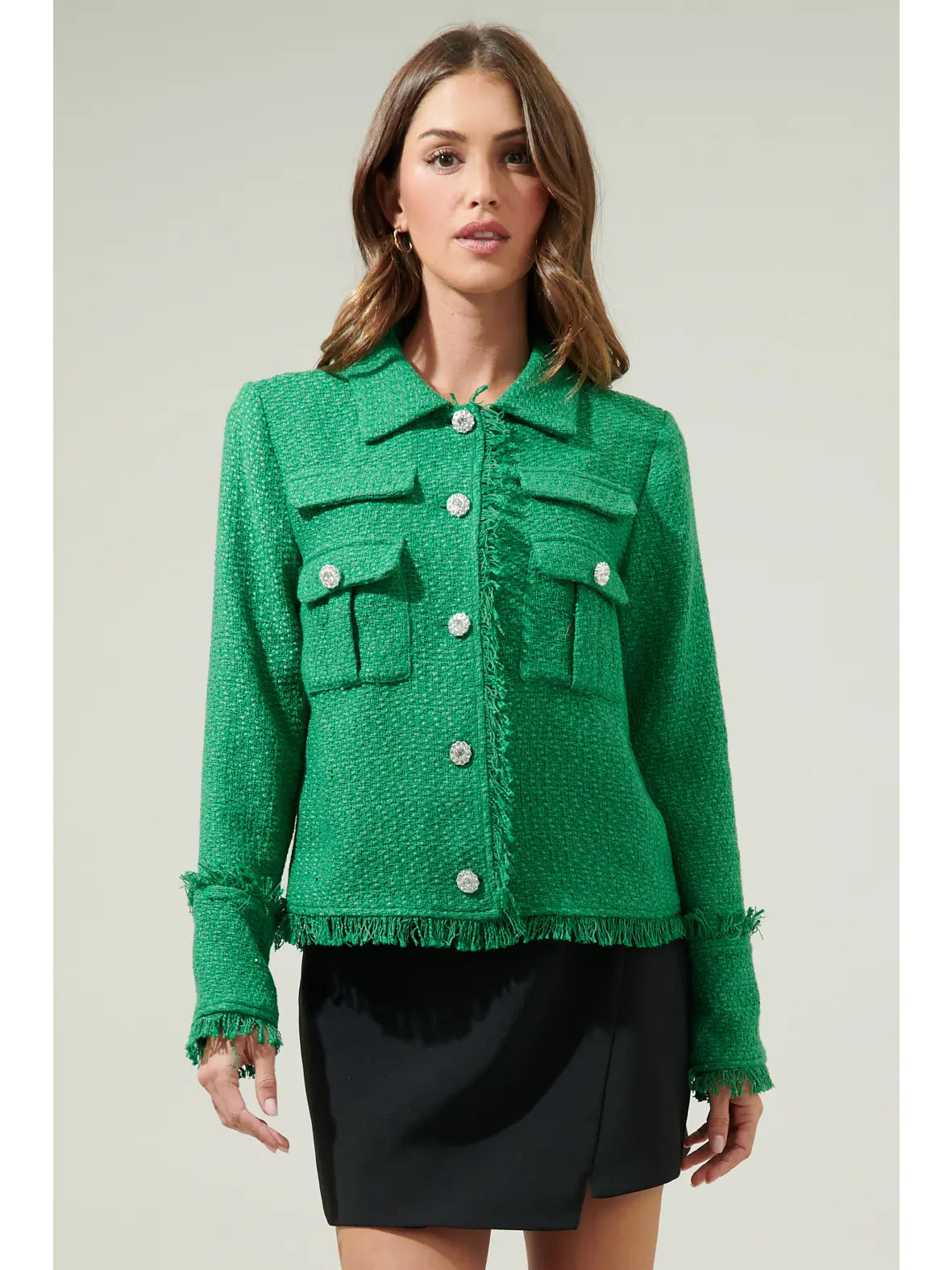 Anyone that comes across the Meadow Green Tweed Blazer will want to wear it all season long! This jacket has a textured. woven tweed that creates a plaid pattern across the collared neckline and long sleeves with an overlapping design. Silver buttons on the front pockets that continue down to a relaxed silhouette. Wear this on top of a plain black top to make it pop!