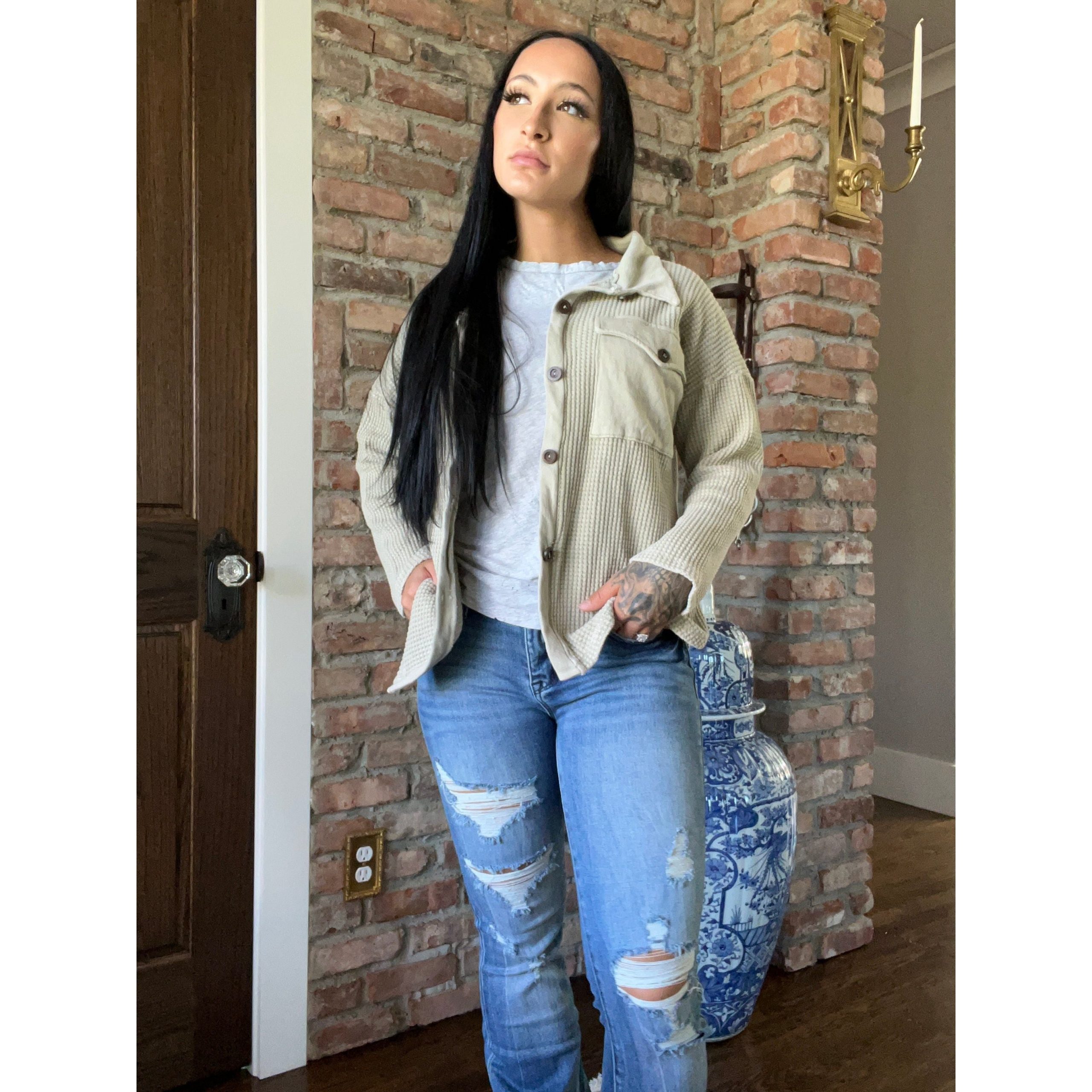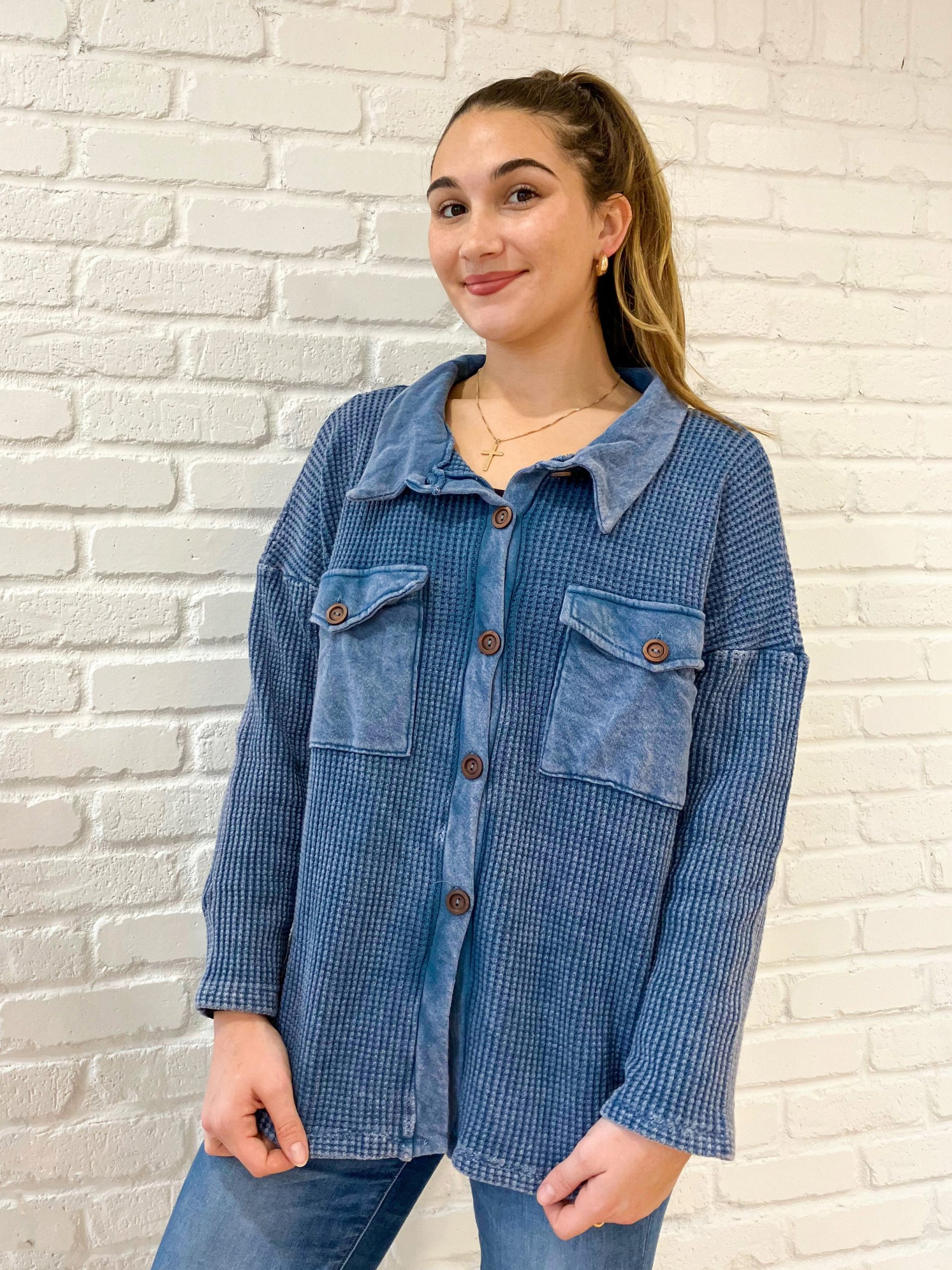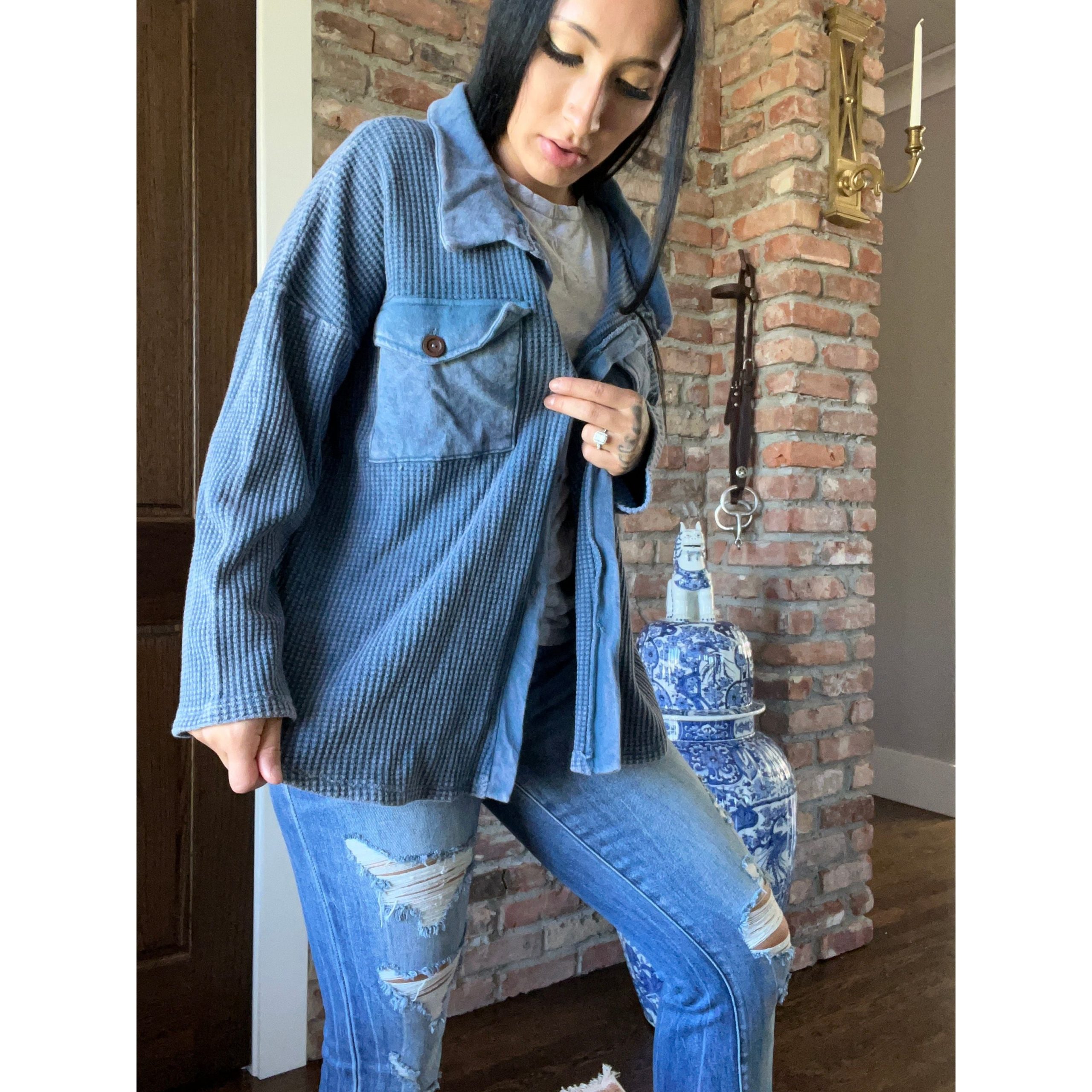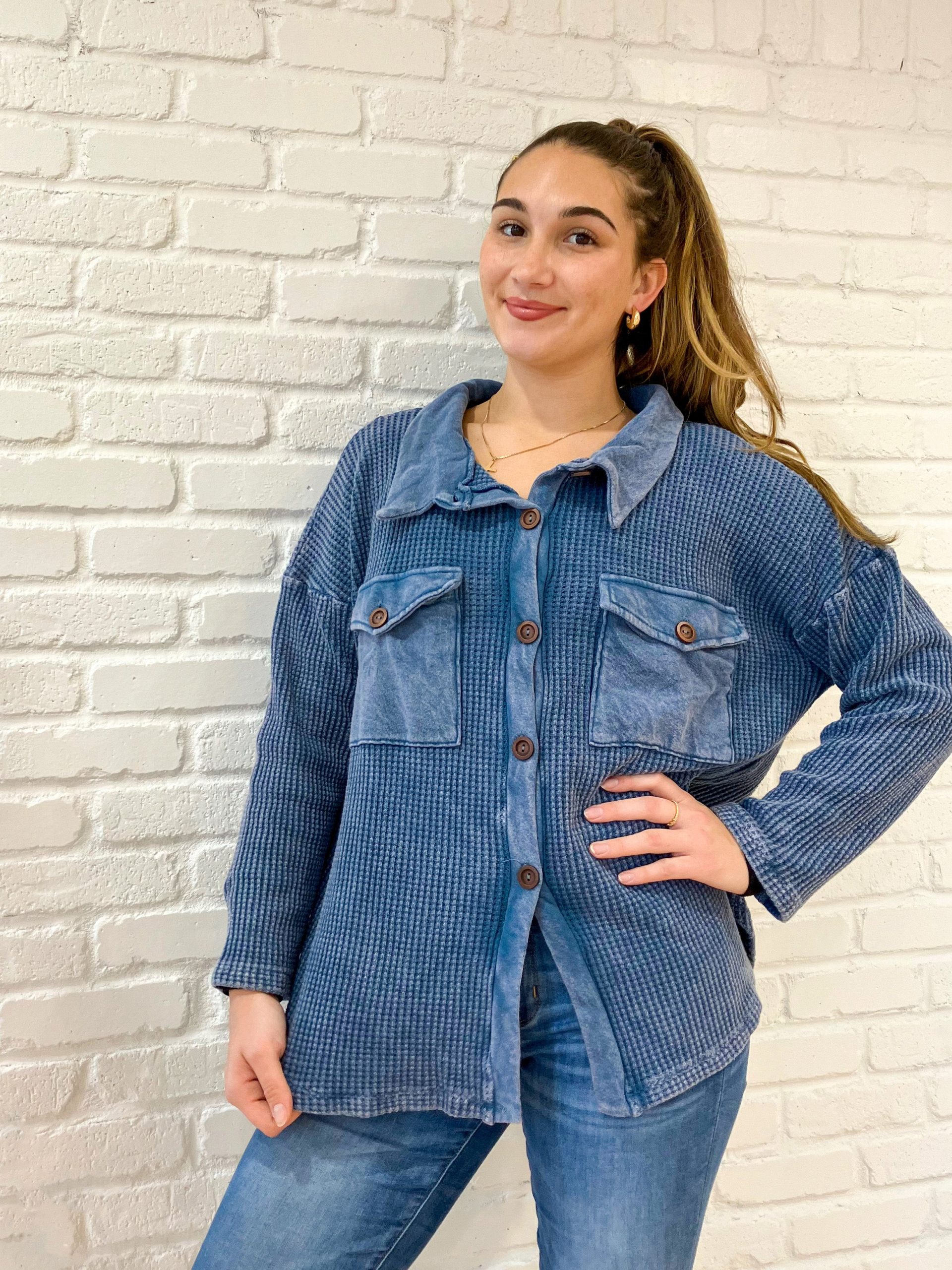 Vintage Mineral Wash Waffle Knit Shacket – Shirt-jacket – Button closure on the front – Utility pockets to chest – Oversize fit – Garment washed – Our Shacket is a must-have in your wardrobe! Available in two colors. Blue&beige. Oversize fit.