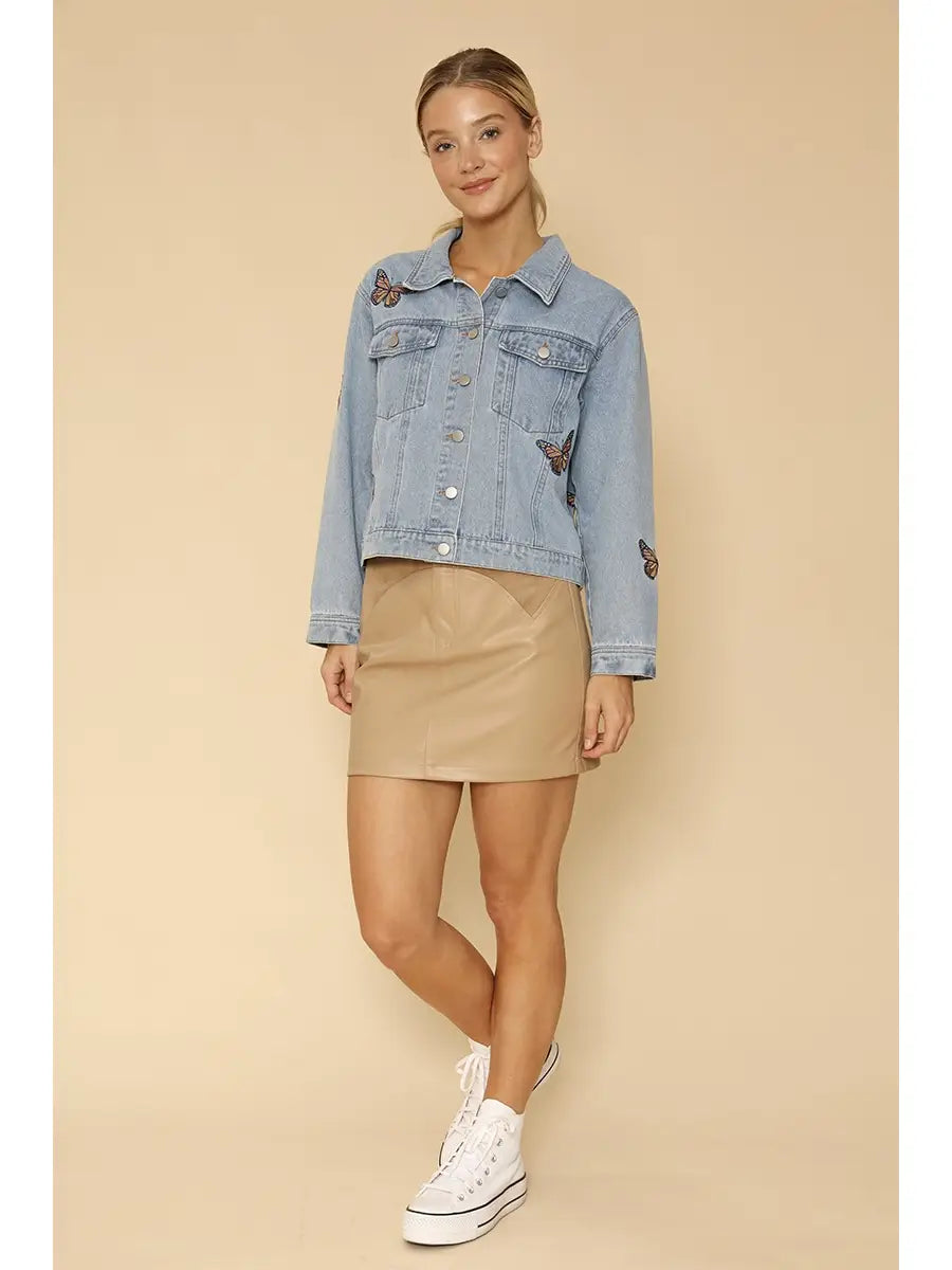 Classic blue denim jacket with embroidered monarch butterflies is the prefect all season denim jacket! No distressing on this jacket. Perfect and beautiful. Runs true to size. Model is wearing size small.